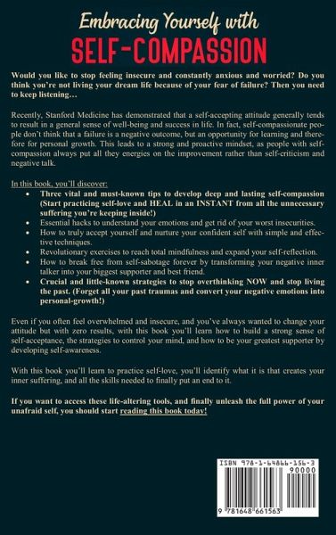 Would you like to stop feeling insecure and constantly anxious and worried? Do you think you're not living your dream life because of your fear of failure? Then you need to keep listening... Recently, Stanford Medicine has demonstrated that a self-accepting attitude generally tends to result in a general sense of well-being and success in life. In fact, self-compassionate people don't think that a failure is a negative outcome, but an opportunity for learning and therefore for personal growth. This leads to a strong and proactive mindset, as people with self-compassion always put all they energies on the improvement rather than self-criticism and negative talk. In this book, you'll discover:Three vital and must-known tips to develop deep and lasting self-compassion (Start practicing self-love and HEAL in an INSTANT from all the unnecessary suffering you're keeping inside!) Essential hacks to understand your emotions and get rid of your worst insecurities. How to truly accept yourself and nurture your confident self with simple and effective techniques.Revolutionary exercises to reach total mindfulness and expand your self-reflection. How to break free from self-sabotage forever by transforming your negative inner talker into your biggest supporter and best friend. Crucial and little-known strategies to stop overthinking NOW and stop living the past. (Forget all your past traumas and convert your negative emotions into personal-growth!) Even if you often feel overwhelmed and insecure, and you've always wanted to change your attitude but with zero results, with this book you'll learn how to build a strong sense of self-acceptance, the strategies to control your mind, and how to be your greatest supporter by developing self-awareness. With this book you'll learn to practice self-love, you'll identify what it is that creates your inner suffering, and all the skills needed to finally put an end to it. If you want to access these life-altering tools, and finally unleash the full power of your unafraid self, you should start reading this book today!