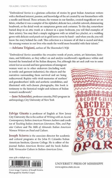 A THOROUGH EXPLORATION OF THE INFLUENCE OF A TRADITIONAL SKILL OF THE ITALIAN DIASPORA For Italian immigrants and their descendants, needlework represents a marker of identity, a cultural touchstone as powerful as pasta and Neapolitan music. Out of the artifacts of their memory and imagination, Italian immigrants and their descendants used embroidering, sewing, knitting, and crocheting to help define who they were and who they have become. This book is an interdisciplinary collection of creative work by authors of Italian origin and academic essays. The creative works from thirty-seven contributors include memoir, poetry, and visual arts while the collection as a whole explores a multitude of experiences about and approaches to needlework and immigration from a transnational perspective, spanning the late nineteenth century to the late twentieth century. At the center of the book, over thirty illustrations represent Italian immigrant women's needlework. The text reveals the many processes by which a simple object, or even the memory of that object, becomes something else through literary, visual, performance, ethnographic, or critical reimagining. While primarily concerned with interpretations of needlework rather than the needlework itself, the editors and contributors to Embroidered Stories remain mindful of its history and its associated cultural values, which Italian immigrants brought with them to the United States, Canada, Australia, and Argentina and passed on to their descendants. Contributions by B. Amore, Mary Jo Bona, Phyllis Capello, Rosette Capotorto, Jo Ann Cavallo, Hwei-Fe'n Cheah, Paola Corso, Peter Covino, Barbara Crooker, Elisa D'Arrigo, Louise DeSalvo, Bettina Favero, Marisa Frasca, Donna R. Gabaccia, Sandra M. Gilbert, Maria Mazziotti Gillan, Lucia Grillo, Maria Grillo, Karen Guancione, Jennifer Guglielmo, Joanna Clapps Herman, Joseph Inguanti, Annie Rachele Lanzillotto, Anne Marie Macari, Giuliana Mammucari, Giovanna Miceli Jeffries, Denise Calvetti Michaels, Lia Ottaviano, Gianna Patriarca, Joan L. Saverino, Maria Terrone, Tiziana Rinaldi Castro, Angela Valeria, Ilaria Vann, Lisa Venditelli, Paul Zarzyski, Christine F. Zinni EDVIGE GIUNTA, Teaneck, New Jersey, is professor of English at New Jersey City University. She is the author of Writing with an Accent: Contemporary Italian American Women Authors and coeditor of Teaching Italian American Literature, Film, and Popular Culture and The Milk of Almonds: Italian American Women Writers on Food and Culture. JOSEPH SCIORRA, Brooklyn, New York, is the associate director for academic and cultural programs at the John D. Calandra Italian American Institute, Queens College. He is editor of the journal Italian American Review and the book Italian Folk: Vernacular Culture in Italian-American Lives.