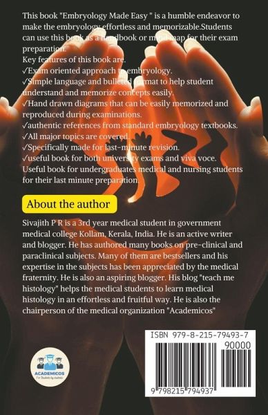Embryology is the science that deals with the development of an individual within the uterus. It is an essential field in the education of medical students because a competent knowledge in embryology is essential to diagnose and treat various congenital anomalies. Embryology is considered as a challenging subject according to most student's opinions. This book "Embryology Made Easy " is a humble endeavor to make the embryology effortless and memorizable. Students can use this book as a handbook or mind map for their exam preparation. Key features of this book are. ¿Exam oriented approach to embryology. ¿Gives basic knowledge about normal human development and equips one for the examination. ¿written in a simple and easy way. ¿Easy memorizing tips and simple ideas to draw diagrams are given which makes it unique in its own way. Every system of embryology is well explained and easily understandable diagrams are placed at suitable places. ¿Well-organized and generously illustrated chapters. Mnemonics are given for easy learning and retention. ¿authentic references from standard embryology textbooks. ¿Quick to read, quick to remember and quick to reproduce. ¿Specifically made for last-minute revision. Useful book for undergraduates medical and nursing students for their last minute preparation.