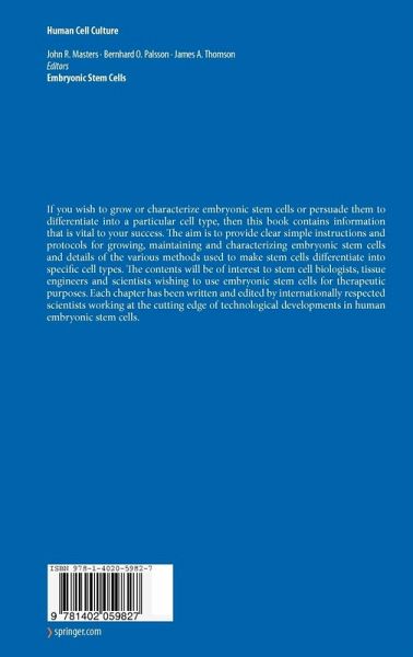 If you wish to grow or characterize embryonic stem cells or persuade them to differentiate into a particular cell type, then this book contains information that is vital to your success. The aim is to provide clear simple instructions and protocols for growing, maintaining and characterizing embryonic stem cells and details of the various methods used to make stem cells differentiate into specific cell types. The contents will be of interest to stem cell biologists, tissue engineers and scientists wishing to use embryonic stem cells for therapeutic purposes. Each chapter has been written and edited by internationally respected scientists working at the cutting edge of technological developments in human embryonic stem cells.