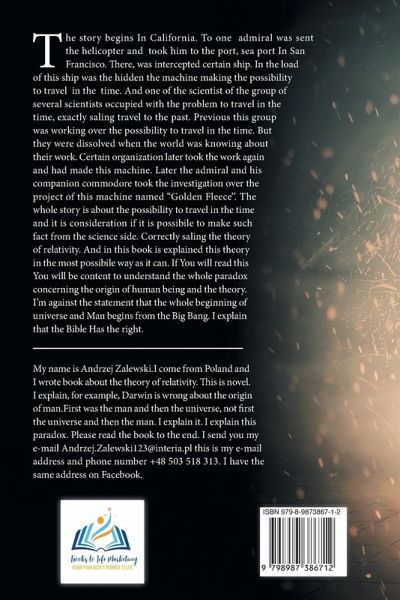 ABOUT THE BOOK The story begins In California. To one admiral was sent a helicopter and took him to the port, sea port In San Francisco. There, was intercepted certain ship. In a load of this ship was the hidden machine making the possibility to travel in the time. And one of the scientists of the group of several scientists is occupied with the problem to travel in time, exactly saling travel to the past. Previous this group was working over the possibility to travel in time. But they were dissolved when the world was knowing about their work. The certain organization later took the work again and made this machine. Later the admiral and his companion commodore took investigation over the project of this machine named ''Golden Fleece''. The whole story is about the possibility to travel in time and it is considered if it is possible to make such a fact from the scientific side. Correctly sailing the theory of relativity. And in this book is explained this theory in the most possible way it can. If You will read this You will be content to understand the whole paradox concerning the origin of human being and the theory. I'm against the statement that the whole beginning of the universe and Man begins from the Big Bang. I explain that the Bible Has the right.