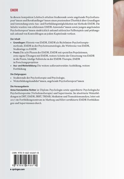 Forschungsergebnisse wie die von Martin Sack (2018) beschreiben die hohe Effektstärke von EMDR in der Behandlung der PTBS und deuten darauf hin, dass auch weitere psychische Störungen mit traumafokussierenden Methoden behandelt werden sollten.In diesem kompakten Lehrbuch erhalten Studierende sowie angehende Psychotherapeut_innen und Berufsanfänger_innen einen praxisnahen Überblick über Grundlagen und Anwendung sowie Aus- und Fortbildungsmöglichkeiten zur Methode EMDR.Die Inhalte wurden von erfahrenen EMDR-Anwender_innen sowie jungen angehenden Psychotherapeut_innen eindrücklich anhand zahlreicher Fallbeispiele und prüfungsnah anhand von Kontrollfragen an jedem Kapitelende verfasst.