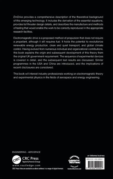 EmDrive provides a comprehensive description of the theoretical background of this emerging technology. It includes the derivation of the essential equations, provides full thruster design details, and describes the manufacture and methods of testing that would enable the work to be correctly reproduced in the appropriate research facilities.