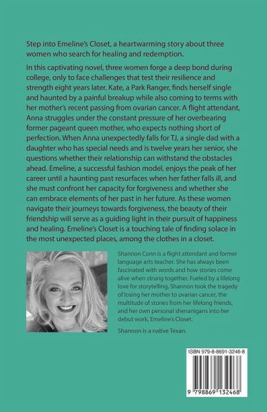 Nestled within the pages of the heartwarming novel "Emeline's Closet" lies a tale of three college friends whose paths serendipitously cross once again after eight long years. Kate, a rugged Park Ranger with a wild mane of golden hair, grapples with the weight of being single following a painful breakup and the recent loss of her mother to ovarian cancer. In contrast, Anna, a poised and polished flight attendant, struggles to meet the impossibly high expectations set by her former pageant queen mother. But when she least expects it, an unexpected connection sparks between her and TJ - a single father ten years her senior. And amidst all this chaos, Emeline, a successful fashion model, must confront her haunting past as her father falls ill, forcing her to confront her ability to forgive truly. As each woman navigates their own winding path toward healing and self-discovery, their bond and unbreakable friendship serve as a guiding light through life's many obstacles. And in the end, amid tears and laughter, they find solace and comfort in an unexpected place - Emeline's closet.