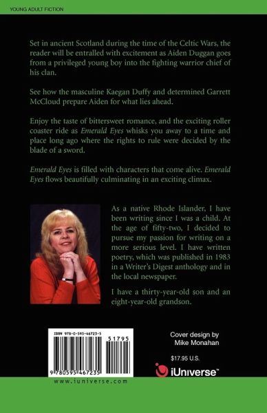 Set in ancient Scotland during the time of the Celtic Wars, the reader will be entralled with excitement as Aiden Duggan goes from a privileged young boy into the fighting warrior chief of his clan. See how the masculine Kaegan Duffy and determined Garrett McCloud prepare Aiden for what lies ahead. Enjoy the taste of bittersweet romance, and the exciting roller coaster ride as Emerald Eyes whisks you away to a time and place long ago where the rights to rule were decided by the blade of a sword. Emerald Eyes is filled with characters that come alive. Emerald Eyes flows beautifully culminating in an exciting climax.