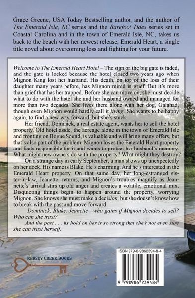 Welcome to The Emerald Heart Hotel - The sign on the big gate is faded, and the gate is usually locked because the hotel closed two years ago when Mignon King lost her husband. His death, on top of the loss of their daughter many years before, has Mignon mired in grief. But it's more than grief that has her trapped. Before she can move on, she must decide what to do with the hotel she and her husband owned and managed for more than two decades. She lives there alone with her dog, Galahad, though even Mignon would hardly call it living. She wants to be happy again, to find a new way forward, but she's stuck. Her longtime friend, Dominick, a real estate agent, wants her to sell the hotel property. Old hotel aside, the acreage alone in the town of Emerald Isle and fronting on Bogue Sound, is valuable and will bring many offers, but that's also part of the problem. Mignon loves the Emerald Heart property and feels responsible for it and wants to protect her husband's memory. What might new owners do with the property? What might they destroy?On a strange day in early September, a man shows up unexpectedly on her dock. He's charming. And he's interested in the Emerald Heart property. On that same day, her long-estranged sister-in-law, Jeanette, returns, and Mignon's troubles magnify as Jeannette's arrival stirs up old anger and creates a volatile, emotional mix. Disquieting things begin to happen around the property, worrying Mignon. She knows she must make a decision, but she doesn't know how to break with the past and move forward.Dominick, Blake, Jeanette-who stands to gain if Mignon decides to sell? Who can she trust?And the past . . . its hold on her is so strong that she's not even sure she can trust herself.