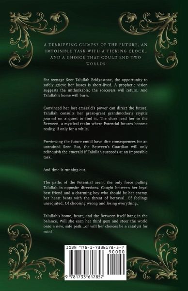 Is a glimpse of the future a gift...or more dangerous than ignorance? Home is supposed to be a haven. But for Talullah Bridgestone, the opportunity to safely grieve her losses is short-lived. A prophetic vision suggests the unthinkable: the sorceress Renevelda will return. And Talullah's home will burn. Convinced her emerald's power can direct the future, Talullah consults her great-great grandmother's cryptic journal on a quest to find it. The clues lead her to the Between, a mystical realm where Potential futures become reality, if only for a while. Previewing the future could have dire consequences for an untrained Seer. But, the Between's Guardian will only give up the emerald if Talullah succeeds at an impossible task. And time is running out. More than just the paths of the Potential pull Talullah in opposite directions. Caught between her loyal best friend and a charming boy who should be her enemy, her heart beats with the threat of betrayal. Of feelings unrequited. Of choosing wrong and losing everything. Talullah's home, heart, and the Between itself hang in the balance. Will she earn her third gem and steer the world onto a new, safe path...or will her choices be a catalyst for ruin?