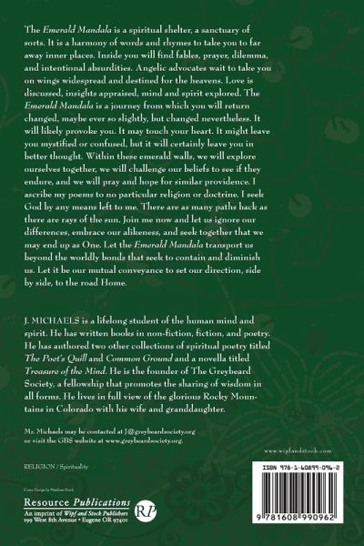 The Emerald Mandala is a spiritual shelter, a sanctuary of sorts. It is a harmony of words and rhymes to take you to far away inner places. Inside you will find fables, prayer, dilemma, and intentional absurdities. Angelic advocates wait to take you on wings widespread and destined for the heavens. Love is discussed, insights appraised, mind and spirit explored. The Emerald Mandala is a journey from which you will return changed, maybe ever so slightly, but changed nevertheless. It will likely provoke you. It may touch your heart. It might leave you mystified or confused, but it will certainly leave you in better thought. Within these emerald walls, we will explore ourselves together, we will challenge our beliefs to see if they endure, and we will pray and hope for similar providence. I ascribe my poems to no particular religion or doctrine. I seek God by any means left to me. There are as many paths back as there are rays of the sun. Join me now and let us ignore our differences, embrace our alikeness, and seek together that we may end up as One. Let the Emerald Mandala transport us beyond the worldly bonds that seek to contain and diminish us. Let it be our mutual conveyance to set our direction, side by side, to the road Home.