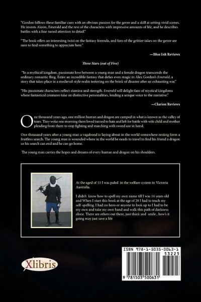 " "Gordon follows these familiar cues with an obvious passion for the genre and a skill at setting vivid scenes. He invests Akron, Emerald and the rest of the characters with impressive amounts of life, and he describes battles with a fine-tuned attention to detail." "The book offers an interesting twist on the fantasy formula, and fans of the grittier takes on the genre are sure to find something to appreciate here." —Blue Ink Reviews Three Stars (out of Five) "In a mythical kingdom, passionate love between a young man and a female dragon transcends the ordinary romantic fling. Enter an incredible fantasy that defies even magic in Alex Gordon’s Emerald, a story that takes place in a medieval-style realm teetering on the brink of disaster after an exhausting war." "His passionate characters reflect stamina and strength. Emerald will delight fans of mystical kingdoms where fantastical creatures take on distinctive personalities, lending a unique voice to the narrative." —Clarion Reviews One thousand years ago, one million human and dragon are camped in what is known as the valley of tears. They woke one morning there loved turned to hate and left for battle with wife child and mother pleading from them to stop fighting and marching with sword axe in hand. One thousand years after a young man a vagabond is laying about in the world somewhere resting form a fruitless search. The young man is wounded where in the world he needs to travel to find his friend a dragon so his search can end and he can go home. The young man carries the hopes and dreams of every human and dragon on his shoulders."