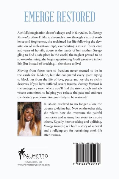 A child's imagination doesn't always end in fairytales. In Emerge Restored, author D.Marie chronicles how through a mix of resilience and forgiveness, she reclaimed her life following the devastation of molestation, rape, excruciating stints in foster care and years of horrific abuse at the hands of her mother. Struggling to find a safe place in the world, the neglect proved to be so overwhelming, she began questioning God's presence in her life. But instead of breaking... she chose to live! Moving from foster care to freedom never seemed to be in the cards for D.Marie, but she conquered every giant trying to block her from the life of love, peace and joy she so richly deserves. If you have suffered severe trauma, Emerge Restored is the emergency room where you'll find the sister, coach and advocate committed to helping you release the past and embrace the destiny you desire. Are you ready to be restored? D. Marie resolved to no longer allow the trauma to define her. Now on the other side, she relates how she overcame the painful memories and is using her story to inspire others. Equally heartbreaking and uplifting, Emerge Restored, is a both a story of survival and a rallying cry for reclaiming one's life after trauma.