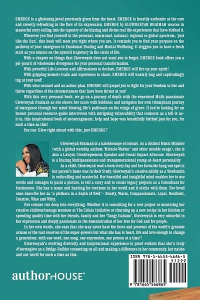 EMERGE is a glistening jewel preciously given from the heart. EMERGE is heartily authentic at the core and sweetly refreshing in the flow of its expression. EMERGE by GLOWREEYAH BRAIMAH weaves in masterful story-telling into the tapestry of the blazing and divine real life-experiences that have birthed it. Wherever you find yourself in the personal, communal, national, regional or global spectrum, 'just like the Sun', this book will meet you right where you are. It reminds you to find your purpose on the pathway of your emergence to Emotional Healing and Mental Wellbeing. It triggers you to have a fresh start as you remain on the upward trajectory in the circle of life. With a chapter on things that Glowreeyah does not want you to forget, EMERGE book offers you a pot-pourri of wholesome divergence for your personal transformation. With powerful Life-Lessons and Affirmations to declare, EMERGE will fire up your spirit! With gripping memoir-trails and experience to share, EMERGE will warmly hug and captivatingly tug at your soul! With wise counsel and an action-plan, EMERGE will propel you to fight for your freedom to live and thrive regardless of the circumstances that have been thrust at you! With this very personal book, we go on a journey of depth with the renowned Multi-passionate Glowreeyah Braimah as she shows her scars with boldness and navigates her own triumphant journey of emergence through her mind-blowing life's pathways on the wings of grace. If you're looking for an honest personal resource-guide interwoven with intriguing vulnerability that connects as a tell-it-as-it-is, this inspirational book of encouragement, help and hope was beautifully birthed just for you, for such a time as this! You can 'Glow right ahead with this, just EMERGE!'