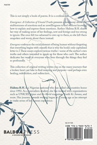 This is not simply a book of poems. It is a confessional. Emergence: A Collection of Unsaid Truths presents a testimony about the stubbornness of emotions and an unwillingness to feel without knowing how to explain and express those emotions. Author Halima B.H. shares her way of making sense of her feelings, new and foreign and too strong to ignore. She once felt too ashamed to own up to them, so she left them unspoken and wrote about them instead. Emergence embraces the social element of being human without forgetting that everything begins with oneself; that is why the book's only capitalised letter is I. These essays explore various truths-some of the author's own truths and others intended to speak up for those who can't. The author dedicates her work to everyone who lives through the things they feel so profoundly. This collection of original writing invites you on the many journeys that a broken heart can take to find meaning and purpose-and perhaps even healing, redefinition, and redirection.