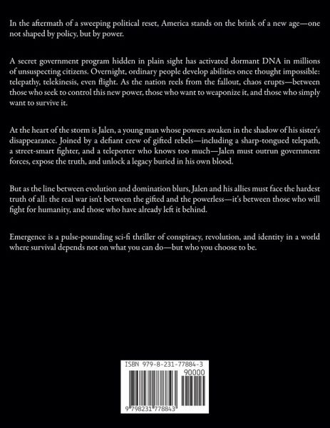In the aftermath of a sweeping political reset, America stands on the brink of a new age-one not shaped by policy, but by power. A secret government program hidden in plain sight has activated dormant DNA in millions of unsuspecting citizens. Overnight, ordinary people develop abilities once thought impossible: telepathy, telekinesis, even flight. As the nation reels from the fallout, chaos erupts-between those who seek to control this new power, those who want to weaponize it, and those who simply want to survive it. At the heart of the storm is Jalen, a young man whose powers awaken in the shadow of his sister's disappearance. Joined by a defiant crew of gifted rebels-including a sharp-tongued telepath, a street-smart fighter, and a teleporter who knows too much-Jalen must outrun government forces, expose the truth, and unlock a legacy buried in his own blood. But as the line between evolution and domination blurs, Jalen and his allies must face the hardest truth of all: the real war isn't between the gifted and the powerless-it's between those who will fight for humanity, and those who have already left it behind. Emergence is a pulse-pounding sci-fi thriller of conspiracy, revolution, and identity in a world where survival depends not on what you can do-but who you choose to be.