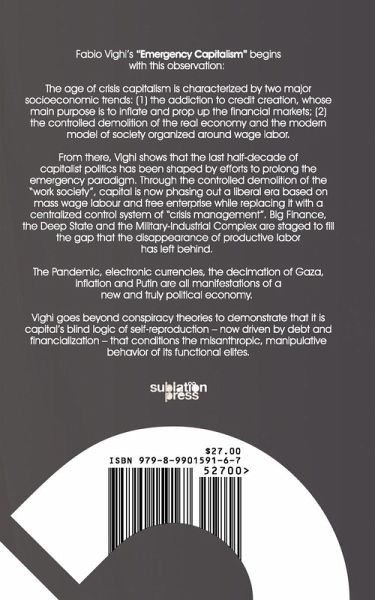 Fabio Vighi's "Emergency Capitalism" begins with this observation: The age of crisis capitalism is characterized by two major socioeconomic trends: 1) the addiction to credit creation, whose main purpose is to inflate and prop up the financial markets; 2) the controlled demolition of the real economy and the modern model of society organized around wage labor. From there, Vighi shows that the last half-decade of capitalist politics has been shaped by efforts to prolong the emergency paradigm. Through the controlled demolition of the "work society," capital is now phasing out a liberal era based on mass wage labor and free enterprise while replacing it with a centralized control system of "crisis management." Big Finance, the Deep State, and the Military-Industrial Complex are staged to fill the gap that the disappearance of productive labor has left behind. The Pandemic, electronic currencies, the decimation of Gaza, Inflation and Putin are all manifestations of a new and truly political economy. Vighi goes beyond conspiracy theories to demonstrate that it is capital's blind logic of self-reproduction--now driven by debt and financialization--that conditions the misanthropic, manipulative behavior of its functional elites.