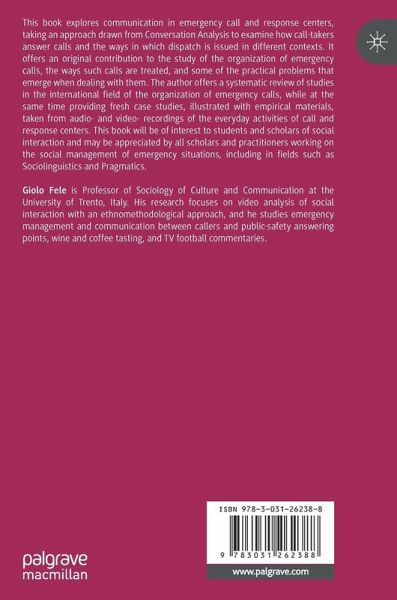This book provides a comprehensive analysis of emergency communication, grounded in conversation analysis and enriched with real-world data from emergency dispatch centers in Northern Italy. ... This book is a seminal work that advances our understanding of emergency call handling. Its thematic organization, rigorous methodology, and practical relevance ensure its place as a valuable contribution to the field. This book is particularly beneficial for those involved in emergency communication and public safety, offering both theoretical insights and practical solutions. (Zheng Chen, Language in Society, Vol. 54 (2), 2025)