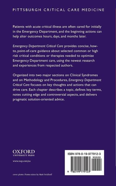 * Part I: Clinical Syndromes * Chapter 1: Approach to Undifferentiated Organ Failure/ Shock ("Blue or Bad) (Lillian Emlet) * Chapter 2: Sepsis and Shock with Infection (Alan Jones and Alan Heffner) * Chapter 3: Respiratory Failure (Including Parenchymal, Vascular, and Central Causes) (Dave Gaieski and Munish Goyal) * Chapter 4: Acute Heart Failure * (Tertius Tuy and William Frank Peacock) * Chapter 5: Acute MI, Acute Coronary Syndromes, Dysrhythmias, Pacemakers, and AICDs * (Glen Michael and Robert O'Connor) * Chapter 6: Acute Kidney Injury in the Emergency Department (John Kellum) * Chapter 7: Coma and Altered Mental Status (J. Stephen Huff and Robert Stevens) * Chapter 8: Post-cardiac arrest care (Stephen Trecziak) * Chapter 9: Intracranial Hemorrhage and Acute ischemic stroke * (Opeolu Adeoye and Edward Jauch) * Chapter 10: Management of the Critically Poisoned Patient (Eric Lavonas) * Chapter 11: Multisystem trauma and burns (Raquel Forsythe) * Chapter 12: Massive bleeding including GI (Charles Wira and Khoshal Latifzai) * Part II: Methodology and Procedures * Chapter 13: Procedural Analgesia and Sedation (Moderate and Deep) (John Burton) * Chapter 14: Monitoring Technology: Invasive and Non-invasive (Bryant Nguyen) * Chapter 15: Airway Management (Henry Wang) * Chapter 16: Ultrasound for shock (Robert Hyde) * Chapter 17: Blood product and procoagulant therapies (Edward Sloan and Donald Yealy)