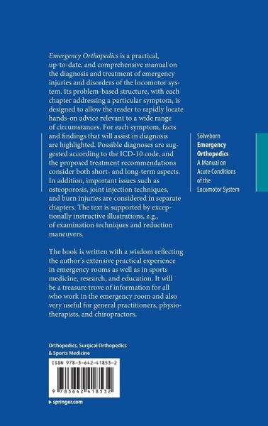 Emergency Orthopedics is a practical, up-to-date, and comprehensive manual on the diagnosis and treatment of emergency injuries and disorders of the locomotor system. Its problem-based structure, with each chapter addressing a particular symptom, is designed to allow the reader to rapidly locate hands-on advice. For each symptom, facts and findings that will assist in diagnosis are highlighted. Possible diagnoses are suggested according to the ICD-10 code, and the proposed treatment recommendations consider both short- and long-term aspects. The text is supported by exceptionally instructive illustrations, e.g., of examination techniques and reduction maneuvers. The author has extensive practical experience in emergency rooms as well as in sports medicine, research, and education. This book will be a treasure trove of information for all who work in the emergency room and will also be very useful for general practitioners, physiotherapists, and chiropractors.
