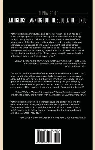 The challenges facing a solo entrepreneur when calamity strikes are unique in the realm of disaster planning, and the only effective strategy for preventing a business failure after an unexpected major setback is to have a clearly thought-out emergency backup plan. This book guides you to being 100 percent ready for the worst-case scenario. Disasters are sudden, calamitous events that can bring about great loss and failure to a business. Some disasters can be prevented through good judgment and careful planning; others-whether "acts of God" such as flood or fire or a personal health crisis-cannot be. What will happen if the one person responsible for the day-to-day operations of a solo entrepreneurship is suddenly incapacitated and unable to manage the business? In cases of small businesses that do not have a clear backup or disaster recovery plan, the outcome is often the total failure of the business. This book is both a wakeup call and an action plan for small business owners. It will guide readers toward creating a backup system that will enable a business to "run itself" without the immediate presence of its owner-for a week, a month, or even longer. The author presents a tested strategy that has its roots in preparing for natural disasters, and replaces the all-too-common refusal to believe that bad things can and do happen with hard facts and realism. Clearly, solopreneurs cannot afford to take risks of failure when it comes to their businesses-the most important thing in their lives aside from family and health.