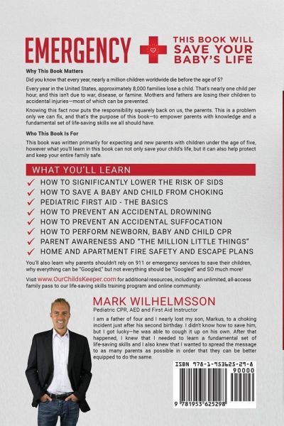 Every year in the United States, approximately 8,000 families lose a child. That's nearly one child per hour, and this isn't due to war, disease, or famine. Mothers and fathers are losing their children to accidental injuries-most of which can be prevented. Knowing this fact now puts the responsibility squarely back on us, the parents. This is a problem only we can fix, and that's the purpose of this book: to empower parents with knowledge and a fundamental set of life-saving skills we all should have. Author Mark Wilhelmsson lived every parent's worst nightmare when he found his toddler-son choking and unable to breathe. Panicked and with no training, Mark could only watch helplessly as his son tried to clear the blockage on his own. Amazingly, young Markus was able to cough it up on his own, but thousands of parents every year do not get so lucky. Now a certified CPR instructor by the American Red Cross, Mark shares exactly what every parent needs to do and learn to keep their kids safe, from developing and practicing a fire escape plan to using a portable defibrillator and, of course, rescuing a choking child. More than just an emergency first aid manual, Wilhelmsson presents detailed steps on performing CPR and AED use. Each chapter covers a specific skill and preparedness lesson, including the prevention of that mysterious silent killer, SIDS (Sudden Infant Death Syndrome). These are not fringe skills to be left to first responders and medical personnel; these are the foundational parenting skills that every child should be guarded by. This book was written primarily for expecting and new parents with children under the age of five; however, what you'll learn in this book can help protect and keep your entire family safe. You'll also learn why parents shouldn't rely on 911 or emergency services to save their children, why everything can be "Googled," but not everything should be "Googled" and SO much more! Visit www.OurChildsKeeper.com for additional resources, including an unlimited, all-access family pass to our life-saving skills training program and online community.