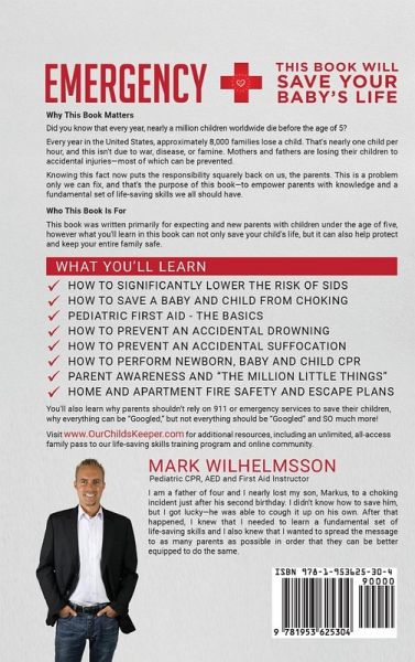 Every year in the United States, approximately 8,000 families lose a child. That's nearly one child per hour, and this isn't due to war, disease, or famine. Mothers and fathers are losing their children to accidental injuries-most of which can be prevented. Knowing this fact now puts the responsibility squarely back on us, the parents. This is a problem only we can fix, and that's the purpose of this book: to empower parents with knowledge and a fundamental set of life-saving skills we all should have. Author Mark Wilhelmsson lived every parent's worst nightmare when he found his toddler-son choking and unable to breathe. Panicked and with no training, Mark could only watch helplessly as his son tried to clear the blockage on his own. Amazingly, young Markus was able to cough it up on his own, but thousands of parents every year do not get so lucky. Now a certified CPR instructor by the American Red Cross, Mark shares exactly what every parent needs to do and learn to keep their kids safe, from developing and practicing a fire escape plan to using a portable defibrillator and, of course, rescuing a choking child. More than just an emergency first aid manual, Wilhelmsson presents detailed steps on performing CPR and AED use. Each chapter covers a specific skill and preparedness lesson, including the prevention of that mysterious silent killer, SIDS (Sudden Infant Death Syndrome). These are not fringe skills to be left to first responders and medical personnel; these are the foundational parenting skills that every child should be guarded by. This book was written primarily for expecting and new parents with children under the age of five; however, what you'll learn in this book can help protect and keep your entire family safe. You'll also learn why parents shouldn't rely on 911 or emergency services to save their children, why everything can be "Googled," but not everything should be "Googled" and SO much more! Visit www.OurChildsKeeper.com for additional resources, including an unlimited, all-access family pass to our life-saving skills training program and online community.