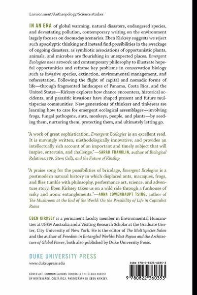 In Emergent Ecologies Eben Kirksey insists that we should turn our attention toward small-scale ecologies and search for hope in the efforts of individuals who are building new ecologies, and in the plants, animals, and fungi that are flourishing in unexpected places.