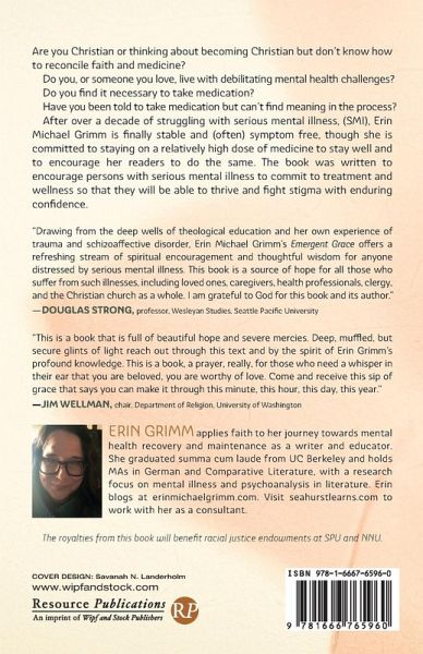 Are you Christian or thinking about becoming Christian but don't know how to reconcile faith and medicine? Do you yourself, or someone you love, live with debilitating mental health challenges? Do you find it necessary to take medicine? Have you been told to take medicine but can't find meaning in the process? After over a decade of struggling with serious mental illness,(SMI), Erin Michael Grimm is finally stable and (often) symptom free, though she is committed to staying on a relatively high dose of medicine to stay well and to encourage her readers to do the same. The book was written to encourage persons with serious mental illness to commit to treatment and wellness so that they will be able to thrive and fight stigma with enduring confidence.