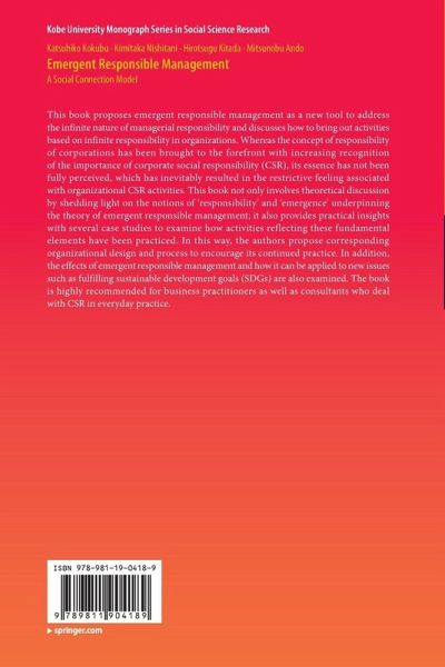 This book proposes emergent responsible management as a new tool to address the infinite nature of managerial responsibility and discusses how to bring out activities based on infinite responsibility in organizations. Whereas the concept of responsibility of corporations has been brought to the forefront with increasing recognition of the importance of corporate social responsibility (CSR), its essence has not been fully perceived, which has inevitably resulted in the restrictive feeling associated with organizational CSR activities. This book not only involves theoretical discussion by shedding light on the notions of 'responsibility' and 'emergence' underpinning the theory of emergent responsible management; it also provides practical insights with several case studies to examine how activities reflecting these fundamental elements have been practiced. In this way, the authors propose corresponding organizational design and process to encourage its continued practice. In addition, the effects of emergent responsible management and how it can be applied to new issues such as fulfilling sustainable development goals (SDGs) are also examined. The book is highly recommended for business practitioners as well as consultants who deal with CSR in everyday practice.