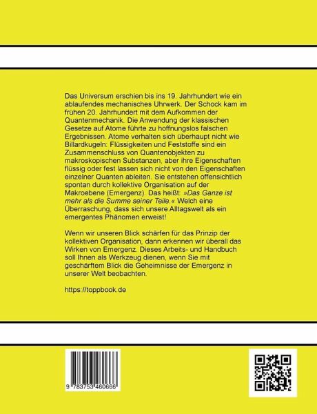Das Universum erschien bis ins 19. Jahrhundert wie ein ablaufendes mechanisches Uhrwerk. Der Schock kam im frühen 20. Jahrhundert mit dem Aufkommen der Quantenmechanik. Die Anwendung der klassischen Gesetze auf Atome führte zu hoffnungslos falschen Ergebnissen. Atome verhalten sich überhaupt nicht wie Billardkugeln: Flüssigkeiten und Feststoffe sind ein Zusammenschluss von Quantenobjekten zu makroskopischen Substanzen, aber ihre Eigenschaften flüssig oder fest lassen sich nicht von den Eigenschaften einzelner Quanten ableiten. Sie entstehen offensichtlich spontan durch kollektive Organisation auf der Makroebene (Emergenz). Das heißt: »Das Ganze ist mehr als die Summe seiner Teile.« Welch eine Überraschung, dass sich unsere Alltagswelt als ein emergentes Phänomen erweist! Wenn wir unseren Blick schärfen für das Prinzip der kollektiven Organisation, dann erkennen wir überall das Wirken von Emergenz. Dieses Arbeits- und Handbuch soll Ihnen als Werkzeug dienen, wenn Sie mit geschärftem Blick die Geheimnisse der Emergenz in unserer Welt beobachten.