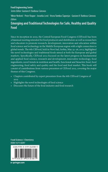 Part I: Safe and Healthy Food.- Safe Food and Healthy Diets.- Food Supply Chains vs. Food Supply Nets.- Food Safety Aspects Concerning Traditional Foods.- Factors Affecting Elimination of Carcinogenic Compounds from Food Products.- Acrylamide Formation in Foods: Role of Composition and Processing.- Detection of Bioactive Compounds in Plants and Food Products.- Beer as an Integral Part of Healthy Diets: Current Knowledge and Perspectives.- Strategy for Screening of Antioxidant Constituents in Protein Hydrolysates.- Part II: Food Quality.- Heat-induced Casein-Whey Protein Interactions in Caprine Milk: Whether are Similar to Bovine milk?.- Whey Protein Edible Coatings: Recent Developments and Applications.- Physical and Sensory Properties of High Added Value Rice Extrudates.- Quality Standardization of Traditional Dry Fermented Sausages: Case of Petrovská Klobása.- Part III: Food Biotechnology.- Traditional and Emerging Technologies for Autochthonous Lactic Acid Bacteria Application.- Effect of Cell Immobilization on Properties of Presumptive Probiotics.- The Biocide and Antibiotic Resistance in Campylobacter Jejuni and Campylobacter Coli.- Microbial Polysaccharides: Between Oil Wells, Food and Drugs.- Part IV: Food Engineering.- Food Cold Chain Management and Optimization.- Encapsulation Technologies for Food Industry.- Innovations in Food Packaging Materials.- Food Processing using Supercritical Fluids.- Aqueous Fractionation of Dry-milled Corn Germ for Food Protein Production.