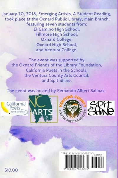 January 20, 2018, Emerging Artists, A Student Reading, took place at the Oxnard Public Library, Main Branch, featuring, seven students from: El Camino High School, Fillmore High School, Oxnard College, Oxnard High School, and Ventura College. The event was supported by the Oxnard Friends of the Library Foundation, California Poets in the Schools, the Ventura County Arts Council, and Spit Shine. The event was hosted by Fernando Albert Salinas. All proceeds will be donated to the Ventura County Youth Poet Laureate program.
