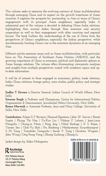 This volume seeks to examine the evolving contours of Asian multilateralism through emerging China and how it is likely to impact on the growth trajectories of Asian countries. From this perspective, it explores the prospects for 'partnership' in Asia, especially in terms of China's engagement with its principal Asian neighbours, especially India. A substantial part of the volume is devoted to debating China--India relations, highlighting their mutual stakes through their economic and security cooperation as well as their engagement with other countries and regional forums. The book furthers the understanding of the rise of China from an Indian perspective while simultaneously locating China's rise in the economic dynamics of an emerging Asia. The volume offers illuminating viewpoints, analyses and insights from multiple perspectives, mixed with academic rigour and up-to-date information. It will be of interest to those engaged in economics, politics, trade relations, Indo-China relations, foreign policy, area studies, public policy, and strategic studies.