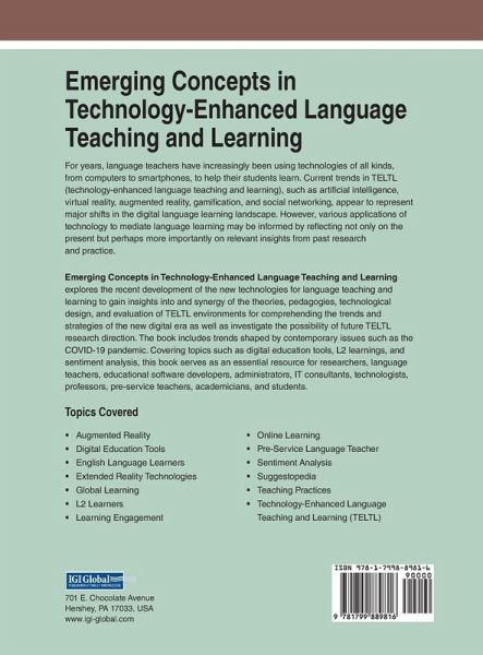 For years, language teachers have increasingly been using technologies of all kinds, from computers to smartphones, to help their students learn. Current trends in TELTL (technology-enhanced language teaching and learning), such as artificial intelligence, virtual reality, augmented reality, gamification, and social networking, appear to represent major shifts in the digital language learning landscape. However, various applications of technology to mediate language learning may be informed by reflecting not only on the present but perhaps more importantly on relevant insights from past research and practice. Emerging Concepts in Technology-Enhanced Language Teaching and Learning explores the recent development of the new technologies for language teaching and learning to gain insights into and synergy of the theories, pedagogies, technological design, and evaluation of TELTL environments for comprehending the trends and strategies of the new digital era as well as investigate the possibility of future TELTL research direction. The book includes trends shaped by contemporary issues such as the COVID-19 pandemic. Covering topics such as digital education tools, L2 learnings, and sentiment analysis, this book serves as an essential resource for researchers, language teachers, educational software developers, administrators, IT consultants, technologists, professors, pre-service teachers, academicians, and students.