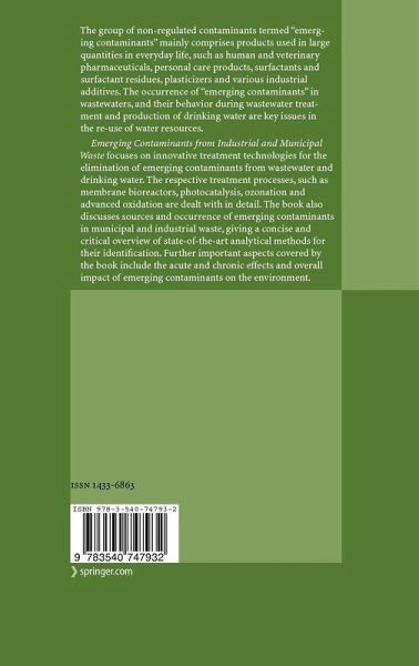 The group of non-regulated contaminants termed "emerging contaminants" mainly comprises products used in large quantities in everyday life, such as human and veterinary pharmaceuticals, personal care products, surfactants and surfactant residues, plasticizers and various industrial additives. The occurrence of "emerging contaminants" in wastewaters, and their behavior during wastewater treatment and production of drinking water are key issues in the re-use of water resources. Emerging Contaminants from Industrial and Municipal Waste focuses on innovative treatment technologies for the elimination of emerging contaminants from wastewater and drinking water. The respective treatment processes, such as membrane bioreactors, photocatalysis, ozonation and advanced oxidation are dealt with in detail. The book also discusses sources and occurrence of emerging contaminants in municipal and industrial waste, giving a concise and critical overview of state-of-the-art analytical methodsfor their identification. Further important aspects covered by the book include the acute and chronic effects and overall impact of emerging contaminants on the environment.
