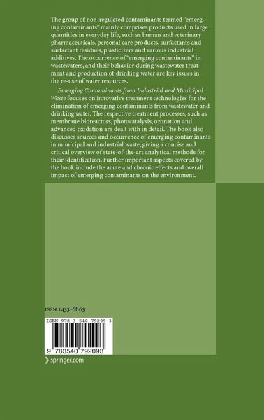 The group of non-regulated contaminants termed "emerging contaminants" mainly comprises products used in large quantities in everyday life, such as human and veterinary pharmaceuticals, personal care products, surfactants and surfactant residues, plasticizers and various industrial additives. The occurrence of "emerging contaminants" in wastewaters, and their behavior during wastewater treatment and production of drinking water are key issues in the re-use of water resources. Emerging Contaminants from Industrial and Municipal Waste focuses on innovative treatment technologies for the elimination of emerging contaminants from wastewater and drinking water. The respective treatment processes, such as membrane bioreactors, photocatalysis, ozonation and advanced oxidation are dealt with in detail. The book also discusses sources and occurrence of emerging contaminants in municipal and industrial waste, giving a concise and critical overview of state-of-the-art analytical methodsfor their identification. Further important aspects covered by the book include the acute and chronic effects and overall impact of emerging contaminants on the environment.