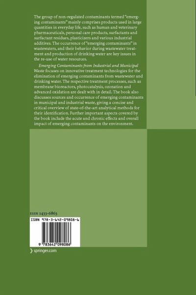 The group of non-regulated contaminants termed "emerging contaminants" mainly comprises products used in large quantities in everyday life, such as human and veterinary pharmaceuticals, personal care products, surfactants and surfactant residues, plasticizers and various industrial additives. The occurrence of "emerging contaminants" in wastewaters, and their behavior during wastewater treatment and production of drinking water are key issues in the re-use of water resources. Emerging Contaminants from Industrial and Municipal Waste focuses on innovative treatment technologies for the elimination of emerging contaminants from wastewater and drinking water. The respective treatment processes, such as membrane bioreactors, photocatalysis, ozonation and advanced oxidation are dealt with in detail. The book also discusses sources and occurrence of emerging contaminants in municipal and industrial waste, giving a concise and critical overview of state-of-the-art analytical methodsfor their identification. Further important aspects covered by the book include the acute and chronic effects and overall impact of emerging contaminants on the environment.