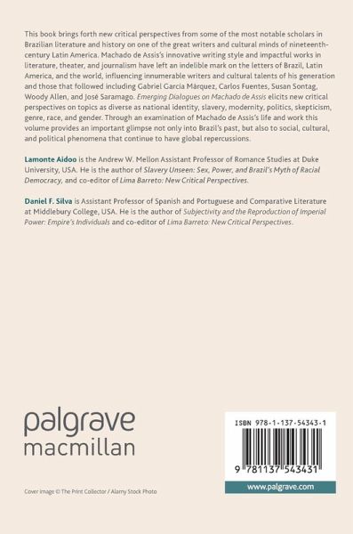 Foreword: Machado de Assis: the Brazilian Master Then and Now Nelson H. Vieira.- Introduction: Lamonte Aidoo and Daniel F. Silva.- Part I: Situating Machado de Assis in History, Literature, and Philosophy.- 1 Machado de Assis: Creator and Character in a Troubled Scene Lilia Moritz Schwarcz.- 2 Machado de Assis and Realism: A Literary Genealogy Hans Ulrich Gumbrecht.- 3 Machado de Assis and Pascal Pedro Meira Monteiro.- Part II: Machado on Race, Identity, and Society.- 4 Machado de Assis: From "Tragic Mulatto" to Human Tragicomedy G. Reginald Daniel.- 5 "Father Versus Mother": Slavery and its Apparatuses Fernando Rocha.- 6 The "Chinese Question" in Machado's Journalism Sonia Roncador.- Part III: Women in Machado's Work.- 7 Writing Womanhood in the New Brazil: Machado's Lição de Botânica Earl E. Fitz.- 8 Curiosity: Undecidability and Gender in Dom Casmurro Marta Peixoto.- Part IV: Machado on Masculinity and Queer Relations.- 9 Machado's Wounded Males Luiz Fernando Valente.- 10 Homoaffectivity Exemplified in Dom Casmurro Camilo Gomides.- 11 Masculinity and Matrimonial Secrets in Dom Casmurro Richard Miskolci.- Part V: Machado, Allegory, and the Narration of Violence.- 12 Machado's Tales of the Fantastic: Allegory and the Macabre M. Elizabeth Ginway.- 13 Machado de Assis and the Secret Heart of Literature Paulo Moreira.- 14 Framing Violence: Narrator and Reader in "Father versus Mother" Giulia Ricco.