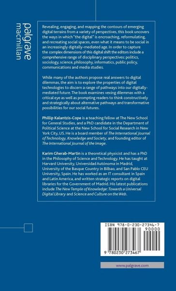 Analyzing the relationship between digital technologies and society this book explores a wide range of complex social issues emerging in a new digital space. Itexamines both the vexing dilemmas with a critical eye as well as prompting readers to think constructively and strategically about exciting possibilities.