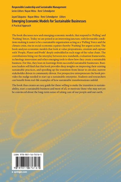 The book discusses new and emerging economic models, that respond to 'Pulling' and 'Pushing' forces. Today we are poised at an interesting juncture, with favourable conditions making it easier to be a sustainable organization acting as a 'Pulling' Force and the climate crisis, rise in social-economic equities thereby 'Pushing' for urgent action. The book analyses economic models that look at value propositions, creation and capture with 'People, Planet and Profit' deeply embedded in each stage of the value chain. The contributions bring out the interplay between new standards, evaluation frameworks, technology innovation and other emerging tools to show how they create a sustainable business. For this, they lean on learnings from successful sustainable businesses. Business leaders will find that this book provides deep insights on improving their existing sustainable practices, and speeding up the transition from linear to circular, narrow stakeholder drivento community driven. For prospective entrepreneurs the book provides the nudge needed to start up a sustainable enterprise. Students and researchers can benefit from real-life examples of how sustainable transformations unfold.