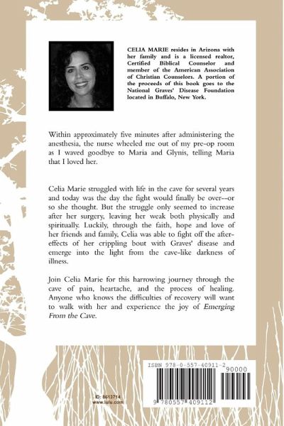 Within approximately five minutes after administering the anesthesia, the nurse wheeled me out of my pre-op room as I waved goodbye to Maria and Glynis, telling Maria that I loved her. Celia Marie struggled with life in the cave for several years and today was the day the fight would finally be over--or so she thought. But the struggle only seemed to increase after her surgery, leaving her weak both physically and spiritually. Luckily, through the faith, hope and love of her friends and family, Celia was able to fight off the after-effects of her crippling bout with Graves' disease and emerge into the light from the cave-like darkness of illness. Join Celia Marie for this harrowing journey through the cave of pain, heartache and the process of healing. Anyone who knows the difficulty of recovery will want to walk with her and experience the joy of Emerging From the Cave.