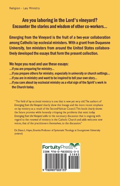 Are you laboring in the Lord's vineyard? Encounter the stories and wisdom of other co-workers... Emerging from the Vineyard is the fruit of a two-year collaboration among Catholic lay ecclesial ministers. With a grant from Duquesne University, ten ministers from around the United States collaboratively developed the essays that form the present collection. We hope you read and use these essays: ...if you are preparing for ministry... ...if you prepare others for ministry, especially in university or church settings... ...if you are in ministry and want to be inspired to tell your own story... ...if you care about lay ecclesial ministry as a vital sign of the Spirit's work in the Church today.