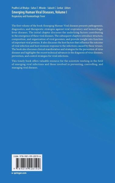 The first volume of the book-Emerging Human Viral diseases presents pathogenesis, diagnostics, and therapeutic strategies against viral respiratory and hemorrhagic fever diseases. The initial chapter discusses the underlying factors contributing to the emergence of these viral diseases. The subsequent chapters introduce structure, composition, and organization of viral genomes, and provide insight into function of important viral proteins. It also discusses the host factors that influence the outcome of viral infection and host immune response to the infections caused by these viruses. The book also discusses clinical manifestation and strategies for the prevention of virus diseases and highlights the recent technical advances in the diagnosis of virus diseases, prevention, and control strategies for viral infections.