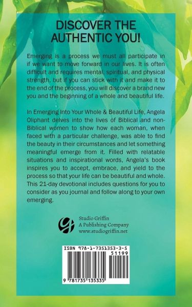 Emerging is a process we must all participate in if we want to move forward in our lives. It is a journey designed to bring about the authentic you. Emerging is often difficult and requires mental, spiritual, and physical strength, but if you can stick with it and make it to the end of the process, you will discover a brand new you and the beginning of a whole and beautiful life. In Emerging Into Your Whole & Beautiful Life, Angela Oliphant delves into the lives of Biblical and non-Biblical women to show how each woman, when faced with a particular challenge, was able to find the beauty in their circumstances and let something meaningful emerge from it. Filled with relatable situations and inspirational words, Angela's book inspires you to accept, embrace, and yield to the process so that your life can be beautiful and whole. This 21-day devotional includes questions for you to consider as you journal and follow along to your own emerging.
