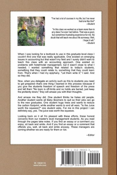 An anthology of graduate level thought containing fifty-two essays on four broad areas: Human Resource Management, Technology Growth, Globalization Issues, and Corporate Social Functions. These Masters of Science in Management students discuss their concerns which range from cultural diversity and managing multi-generation conflicts to oil supply and the execution of Ken Saro Wiwa; from the development of 3D printers and management of work-at-home employees to going green and containing cybercrime. These students have concerns that are all over the world, literally, and when dwelled upon and thought about represent concerns that we all should consider. An excellent supplement to any management class, an excellent read.