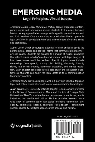 Emerging Media: Virtual Issues, Legal Principles introduces contemporary media and information studies students to the nexus between law and emerging media technology. With a goal to present a clear and succinct overview of communication and media law, the text presents legal doctrines in accessible terms and in the context of current issues and technology. Author Jason Zenor encourages students to think critically about the psychological, social, and political harms that communication technology can cause. Students are exposed to a myriad of current examples that reflect issues in today's media environment, with legal analysis of how these issues could be resolved. Specific topical areas include censorship, false speech, privacy, civil liability, obscenity, identity rights, intellectual property, consumer protection, and market regulation. Each chapter concludes with a case study and discussion questions so students can apply the legal doctrine to a communication technology problem. Emerging Media provides students with a timely and valuable focus on legal and policy issues attendant to new communication technologies.