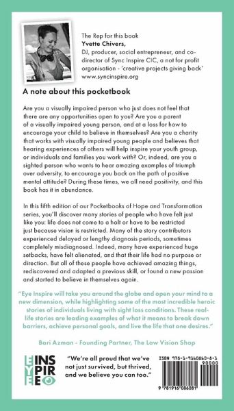 A note about this pocketbook Are you a visually impaired person who just does not feel that there are any opportunities open to you? Are you a parent of a visually impaired young person, and at a loss for how to encourage your child to believe in themselves? Are you a charity that works with visually impaired young people and believes that hearing experiences of others will help inspire your youth group, or individuals and families you work with? Or, indeed, are you a sighted person who wants to hear amazing examples of triumph over adversity, to encourage you back on the path of positive mental attitude? During these times, we all need positivity, and this book has it in abundance. In this fifth edition of our Pocketbooks of Hope and Transformation series, you'll discover many stories of people who have felt just like you: life does not come to a halt or have to be restricted just because vision is restricted. Many of the story contributors experienced delayed or lengthy diagnosis periods, sometimes completely misdiagnosed. Indeed, many have experienced huge setbacks, have felt alienated, and that their life had no purpose or direction. But all of these people have achieved amazing things, rediscovered and adapted a previous skill, or found a new passion and started to believe in themselves again.