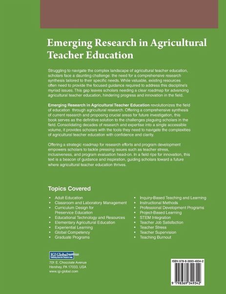 Struggling to navigate the complex landscape of agricultural teacher education, scholars face a daunting challenge: the need for a comprehensive research synthesis tailored to their specific needs. While valuable, existing resources often need to provide the focused guidance required to address this discipline's myriad issues. This gap leaves scholars needing a clear roadmap for advancing agricultural teacher education, hindering progress and innovation in the field. Emerging Research in Agricultural Teacher Education revolutionizes the field of education through agricultural research. Offering a comprehensive synthesis of current research and proposing crucial areas for future investigation, this book serves as the definitive solution to the challenges plaguing scholars in the field. Consolidating decades of research and expertise into a single accessible volume, it provides scholars with the tools they need to navigate the complexities of agricultural teacher education with confidence and clarity.
