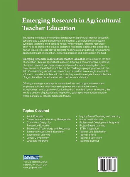 Struggling to navigate the complex landscape of agricultural teacher education, scholars face a daunting challenge: the need for a comprehensive research synthesis tailored to their specific needs. While valuable, existing resources often need to provide the focused guidance required to address this discipline's myriad issues. This gap leaves scholars needing a clear roadmap for advancing agricultural teacher education, hindering progress and innovation in the field. Emerging Research in Agricultural Teacher Education revolutionizes the field of education through agricultural research. Offering a comprehensive synthesis of current research and proposing crucial areas for future investigation, this book serves as the definitive solution to the challenges plaguing scholars in the field. Consolidating decades of research and expertise into a single accessible volume, it provides scholars with the tools they need to navigate the complexities of agricultural teacher education with confidence and clarity.