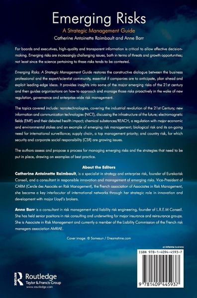 Emerging Risks: A Strategic Management Guide restores the constructive dialogue between the business professional and the expert/scientist community, essential if companies are to anticipate, plan ahead and exploit leading edge ideas. It provides insights into some of the major emerging risks of the 21st century and then guides organizations on how to approach and manage those risks proactively in the wake of new regulation, governance and enterprise-wide risk management.