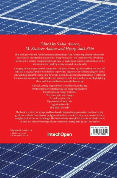 This book provides the fundamental understanding of the functioning of solar cellsand the materials for the effective utilization of energy resources. The main objective of writing this book is to create a comprehensive and easy-to-understand source of information on the advances in the rapidly growing research on solar cells. Emerging Solar Energy Materials comprises 12 chapters written by the experts in the solar cell field and is organized with the intention to provide a big picture of the latest progress in the solar cell field and at the same time give an in-depth discussion on fundamentals of solar cells for interested audiences. In this book, each part opens with a new author's essay highlighting their work for contribution toward solar energy. Critical, cutting-edge subjects are addressed, including: Photovoltaic device technology and energy applications; Functional solar energy materials; New concept in solar energy; Perovskite solar cells; Dye-sensitized solar cells; Organic solar cells; Thin-film solar cells. The book is written for a large and broad readership including researchers and university graduate students from diverse backgrounds such as chemistry, physics, materials science, and photovoltaic device technology. The book includes enough information on the basics to be used as a textbook undergraduate coursework in engineering and the sciences.