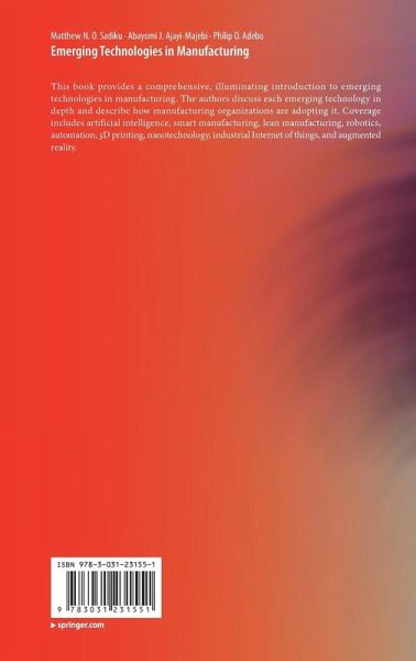 This book reviews emerging technologies in manufacturing. These technologies include artificial intelligence, smart manufacturing, lean manufacturing, robotics, automation, 3D printing, nanotechnology, industrial Internet of things, and augmented reality. The use of these technologies will have a profound impact on the manufacturing industry. The book consists of 19 chapters. Each chapter addresses a single emerging technology in depth and describes how manufacturing organizations are adopting the technology. The book fills an important niche for manufacturing. It is a comprehensive, jargon-free introductory text on the issues, ideas, theories, and problems on emerging technologies in manufacturing. It is a must-read book for beginners or anyone who wants to be updated about emerging technologies.